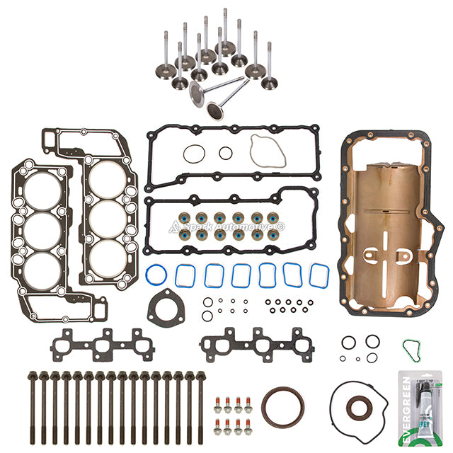 Full Gasket Set Intake Exhaust Valves Fit 02-05 Dodge Chrysler Jeep 3.7L SOHC. This gasket and instake exhaust valve set is just what you need to keep your car in good running order. The gasket and instake exhaust valve set that you will receive in this kit is a high quality gasket that the dealers and rebuilding shops use everyday. So do not settle for lesser quality parts when it comes to engine repair. These gasket and instake exhaust valve sets are designed for the professional installer. It does not come with any installation instructions. If you do not have a service manual, please consult a professional mechanic prior to installing this gasket and instake exhaust valve set.