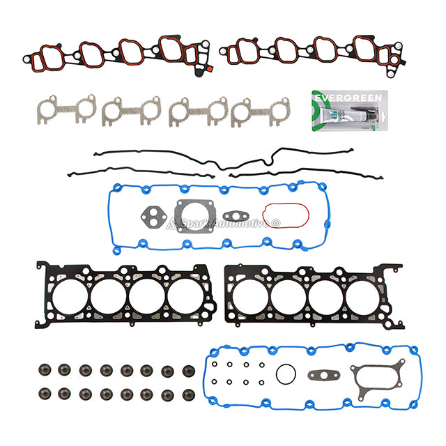 Full Gasket Set Intake Exhaust Valves Fit 00-05 Ford E, F Series V8 5.4 SOHC 16V. This gasket and instake exhaust valve set is just what you need to keep your car in good running order. The gasket and instake exhaust valve set that you will receive in this kit is a high quality gasket that the dealers and rebuilding shops use everyday. So do not settle for lesser quality parts when it comes to engine repair. These gasket and instake exhaust valve sets are designed for the professional installer. It does not come with any installation instructions. If you do not have a service manual, please consult a professional mechanic prior to installing this gasket and instake exhaust valve set.