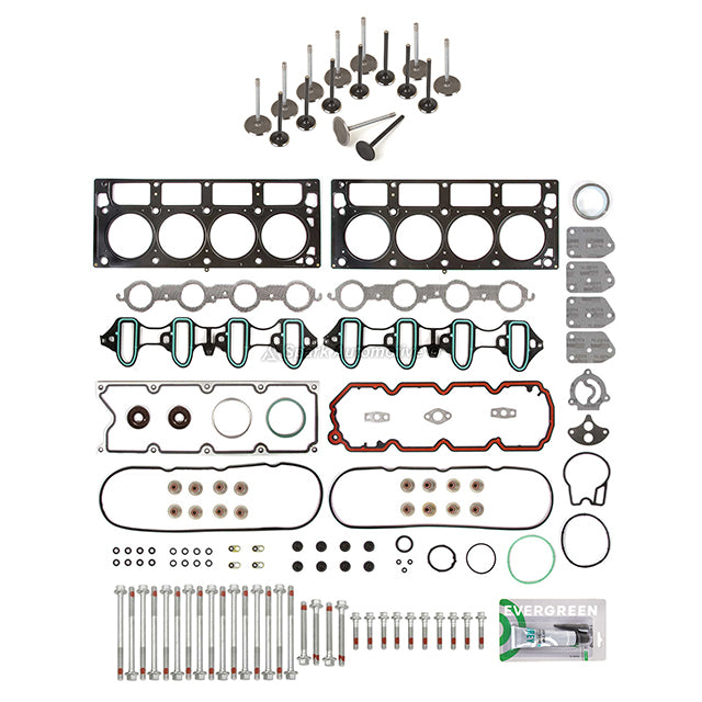 Head Gasket Set Intake Exhaust Valves Fit 02-04 GMC Cadillac Chevrolet 4.8 5.3. This head gasket intake exahaust valve set is just what you need to keep your car in good running order. The head gasket intake exahaust valve set that you will receive in this kit is a high quality gasket that the dealers and rebuilding shops use everyday. So do not settle for lesser quality parts when it comes to engine repair. These head gasket intake exahaust valve sets are designed for the professional installer. It does not come with any installation instructions. If you do not have a service manual, please consult a professional mechanic prior to installing this head gasket intake exahaust valve set.